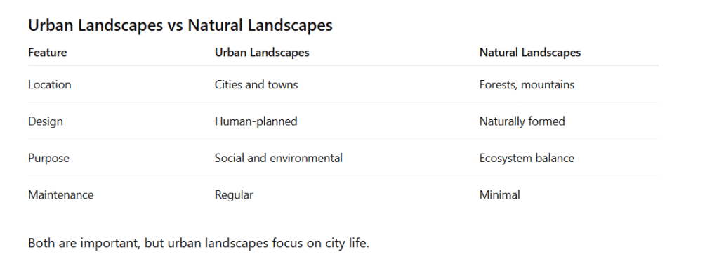 Unlike natural landscapes such as forests or mountains, urban landscapes are designed and managed by people. They are created to support daily life, protect the environment, and make cities more beautiful and comfortable.